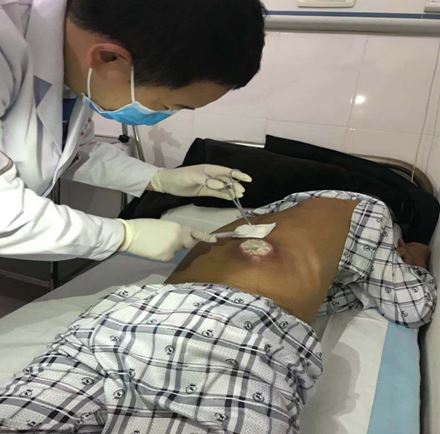 11月5日,万山区人民医院泌尿外科病房来了一位老年患者—老龙,他精神萎靡,伴有双侧腰部疼痛,右侧上臂流脓,后背巨大肿物并伴有破溃流脓,全身散发恶臭。戴超毫不嫌弃,主动接诊了该患者。经过详细检查,发现该患者感染严重,病情复杂,查肾功能:尿素47.32nmol/L,肌酐:756.9μmol/L;血常规:白细胞23.82×109/L,中性粒细胞比率92.3%;腹部CT:双肾结石,双肾重度积水,白蛋白25g/L。当时考虑“脓毒血症,肾功能衰竭,双肾结石,双肾积水,右上臂,后背部巨大脓肿”收入院。在此期间,戴超坚持给老龙换药,完全不在意老龙身上的恶臭。在自己的休息时间,他多次赶往医院,密切观察老龙的病情,时刻注意治疗效果。经过近一周的积极抗感染、保肾、换药治疗后,老龙精神状态明显好转,复查血常规已基本正常,肾功能也有明显改善,背后的脓肿明显缩小。老龙露出了欣慰的笑容,每次见到戴超医生都像见到了亲人般热情。
