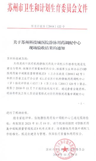 根据原卫生部办公厅《静脉用药集中调配质量管理规范》(卫办医政发[2010]62号)和原江苏省卫生厅办公室《江苏省医疗机构静脉用药调配中心(室)验收评价表(试行)》(苏卫医办[2011]120号)要求,市卫计委于11月7日组织验收组专家对我院静脉用药调配中心进行现场验收。经专家组评审,我院静脉用药调配中心顺利通过现场验收。专家组对我院静脉用药调配中心的建设布局及设施、内部管理和操作流程,都给予了高度的肯定,同时也对中心下一步的工作提出了指导性的意见和建议。