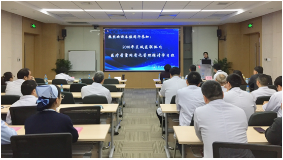 2018年11月30日,由医务处申报的区级继续教育-“区域医联体内医疗质量同质他管理探讨学习班”在行政二楼远程会诊中心成功举办。此次参会的嘉宾有:苏州大学附属第一医院第三党总支书记顾继红、苏州市立医院本部急诊科张志英主任。我院钮金英副院长亲自主持并授课,院内外近100名工作人员到场聆听。