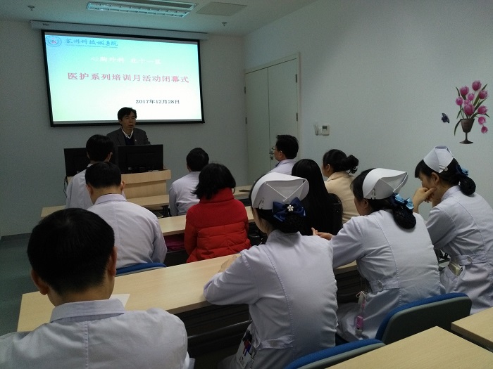 院党委副书记、副院长王诚出席心胸外科医护系列培训月活动闭幕式并致辞,王院长诙谐地说,这是他主持的最小的“闭幕式”;回顾上周中层干部年度述职大会,王院长情真意切地寄语三点:第一,心胸外科一年来工作成绩不少,上月独立病区成立以来,启动医护系列培训,一个多月的时间,完成17场讲座,非常了不得。第二,去年医院推出“强基础,重学习”活动,我们要求持续学习,不光在单位学,在家也要学,相信这一次医护系列培训月活动圆满结束后,心胸外科刘主任与护士长会继续酝酿新一轮培训学习。第三,要注重发挥团队力量,注重团队建设,现在医院的发展势头非常迅猛,医院做大做强了,科室也要做大做强,这样每个人的平台和空间也会更大。随后康复医学中心主任吴勤峰博士主讲《肺癌、食管癌术后康复治疗》。至此,心胸外科医护系列培训月活动圆满结束。